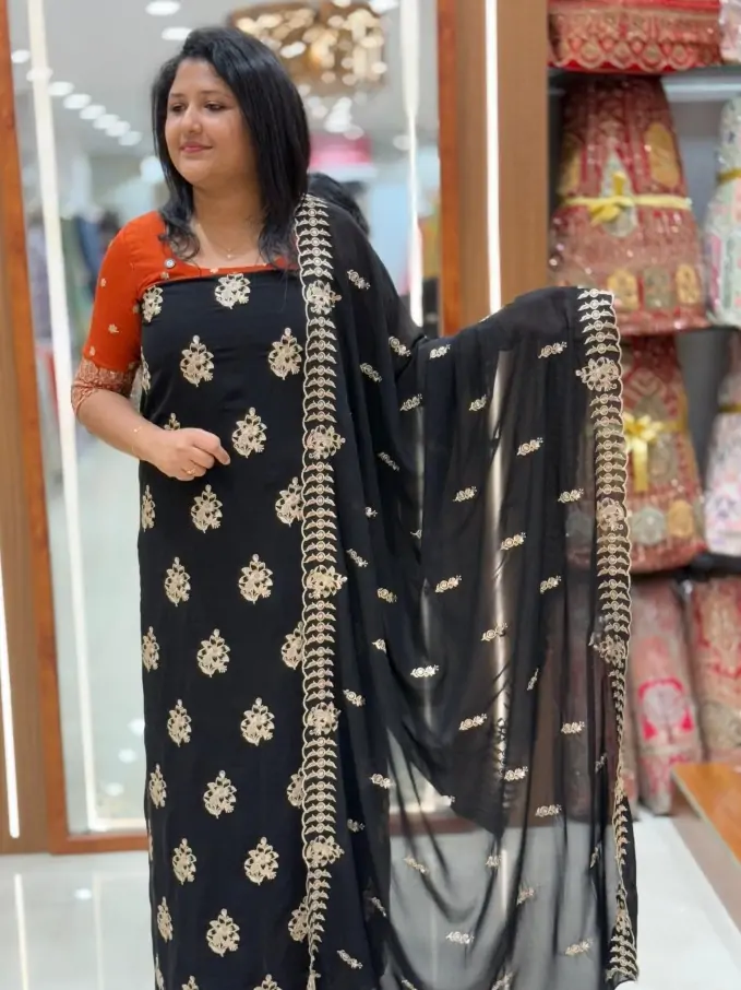 BUDGET FRIENDLY PARTYWEAR UNSTICHED SALWAR SET WITH GOLDEN ZARI DETAILS